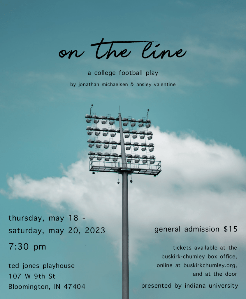 Posted on May 18, 2023May 15, 2023 by Devin MayOn The Line (2023) Player 1 A new play about college football by Jonathan Michaelsen and Ansley Valentinedirected by Ansley Valentine https://www.heraldtimesonline.com/story/entertainment/2023/05/15/on-the-line-depicts-rigors-pitfalls-of-college-football-programs/70200903007/ Related